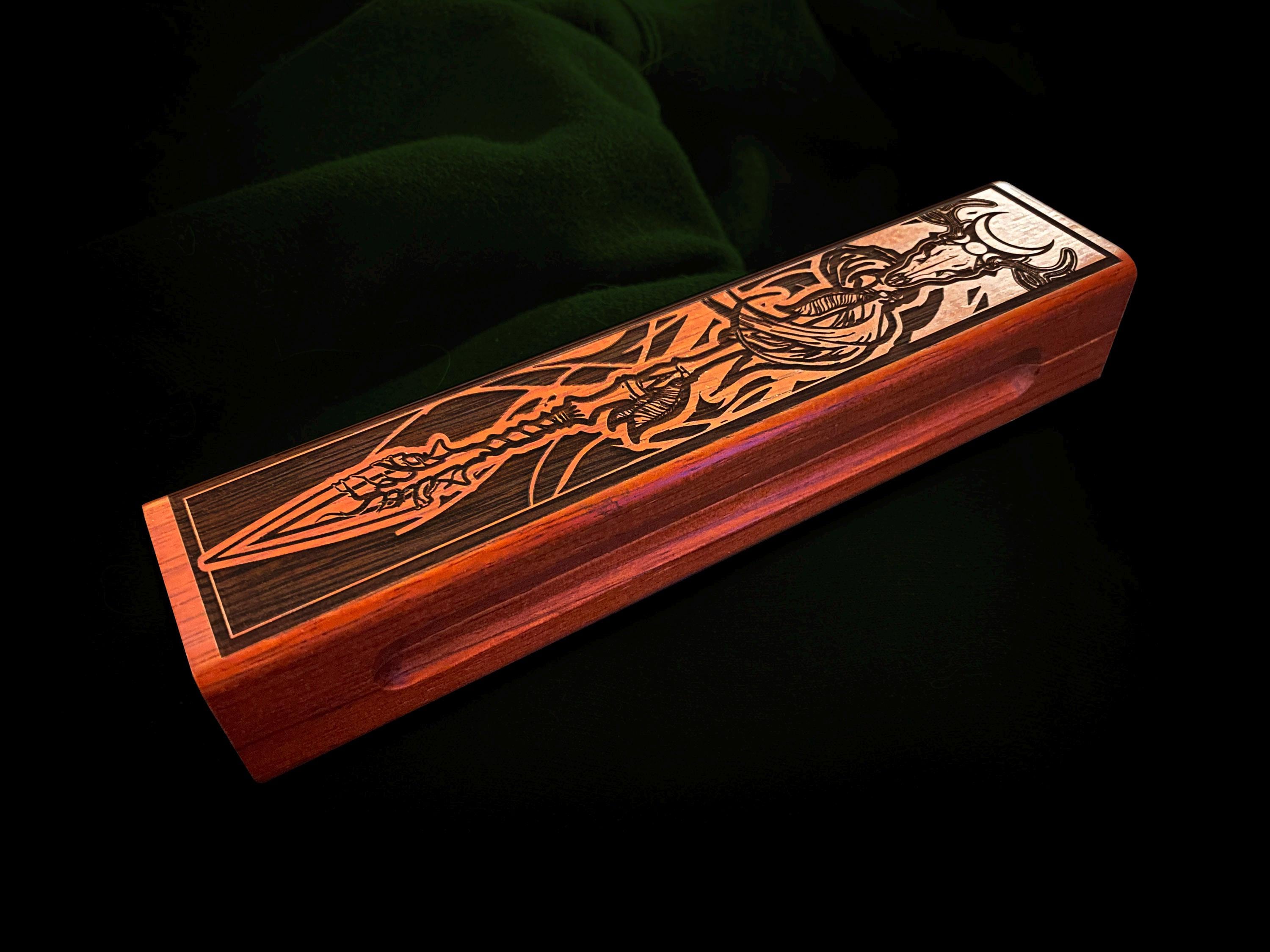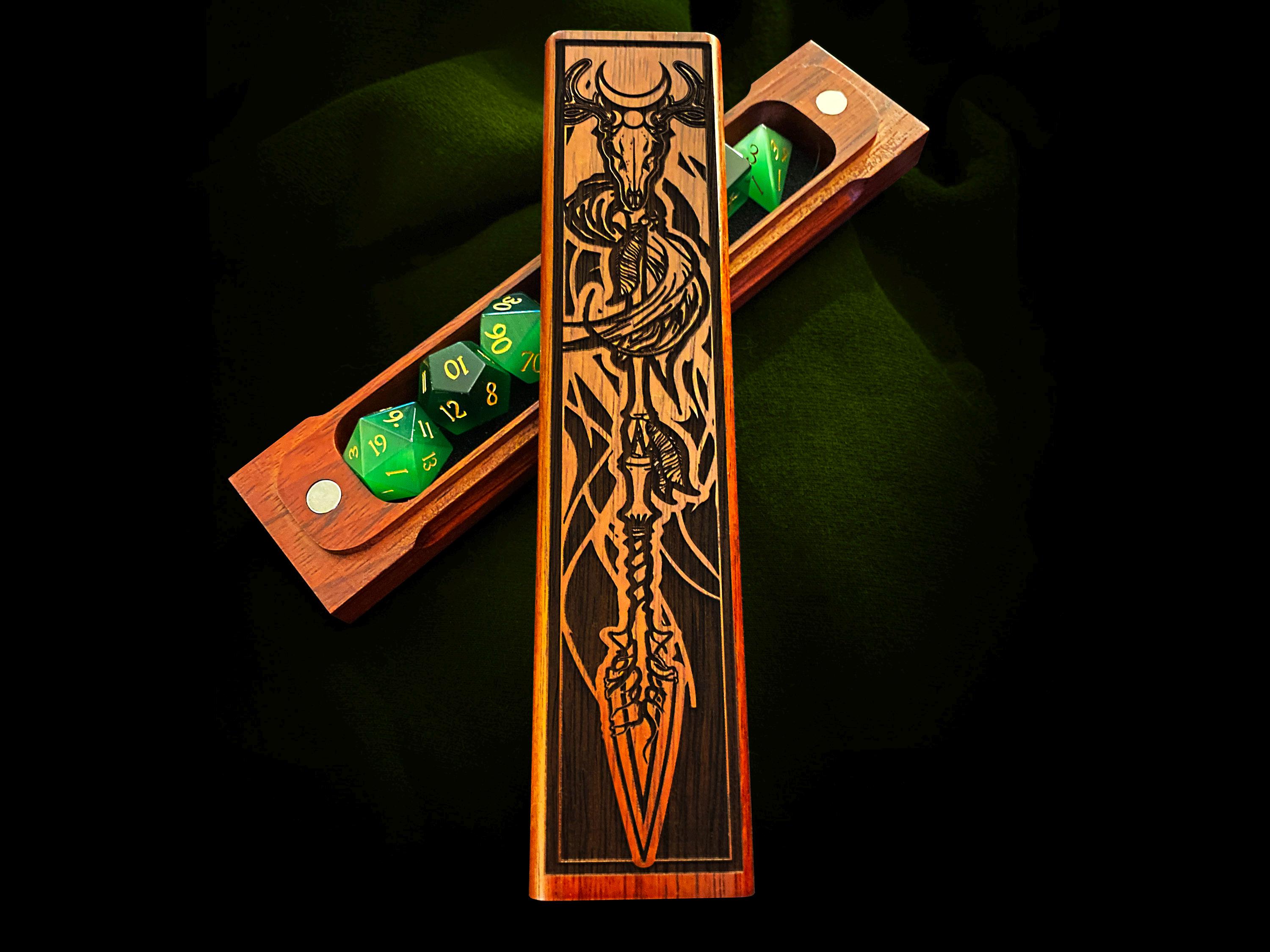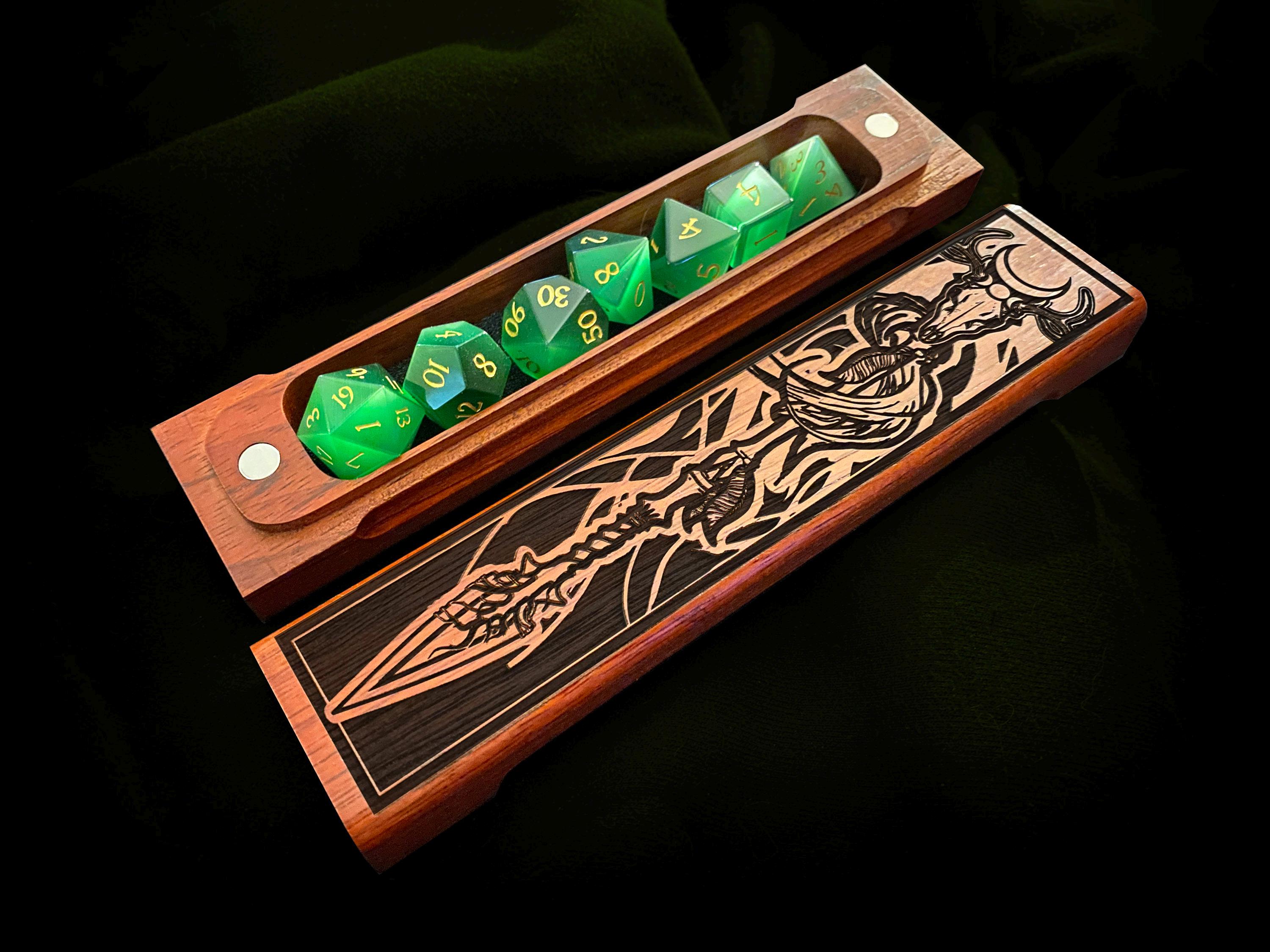 A handcrafted dice box made from solid Brazilian Cherry (Jatoba), built to last a lifetime. Perfect for players of D&D, Pathfinder, or any tabletop RPG. Store and protect your dice in style, or personalize it with custom engraving. Also makes a wonderful and lasting gift for that special player or DM in your life.